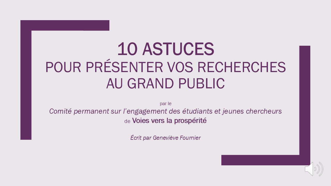 Cette présentation offre des conseils pratiques pour aider les chercheurs à communiquer leurs résultats au-delà du milieu universitaire (par exemple, en impliquant des organisations communautaires, des décideurs politiques, des journalistes ou le grand public). Elle insiste sur l’importance d’aller à la rencontre du public là où il se trouve, sans présumer qu’il comprend le jargon, de choisir quelques canaux de communication stratégiques et de préparer des présentations qui vont droit au but. Les chercheurs sont encouragés à utiliser un langage clair et accessible, à simplifier la conception des diapositives et à se concentrer sur ce qui intéresse le plus les publics non spécialisés : les résultats clés et leur importance.