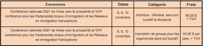 La 9e Conférence nationale annuelle de Voies vers la prospérité et la Conférence de VVP pour les Partenariats locaux d’immigration et les Réseaux en immigration francophone se tiendront en mode virtuel du 8 au 10 novembre 2021. En plus de l’oratrice de marque, il y aura des plénières et ateliers, mais aussi des forums de discussion et un accès aux affiches et exposants pendant les trois jours. Tous les inscrits auront également accès à la Série d’ateliers virtuels organisée en janvier-mars 2022.