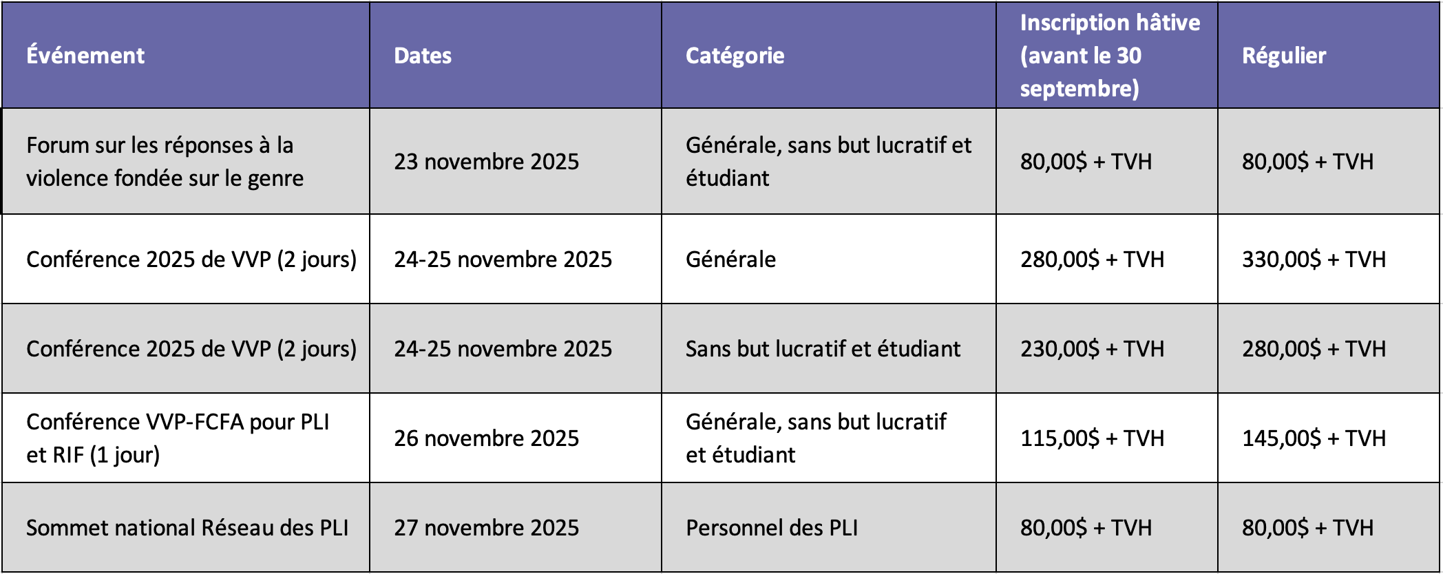 - Des ateliers et tables-rondes en personne lors de la conférence nationale 2025 de VVP, les 24 et 25 novembre, auxquels tous les présentateurs et modérateurs doivent s’être engagés à participer en personne à Halifax.
