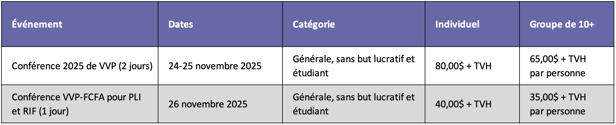 Nous organiserons des ateliers et des tables-rondes simultanés, en personne et virtuels, lors de la Conférence nationale 2025 de VVP et de la conférence VVP-FCFA pour les PLI et les RIF.